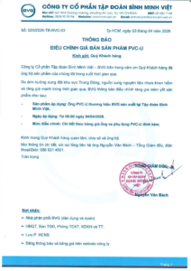 THÔNG BÁO: ĐIỀU CHỈNH GIÁ BÁN SẢN PHẨM ỐNG PVC-U THƯƠNG HIỆU BVG